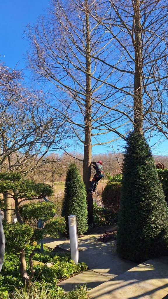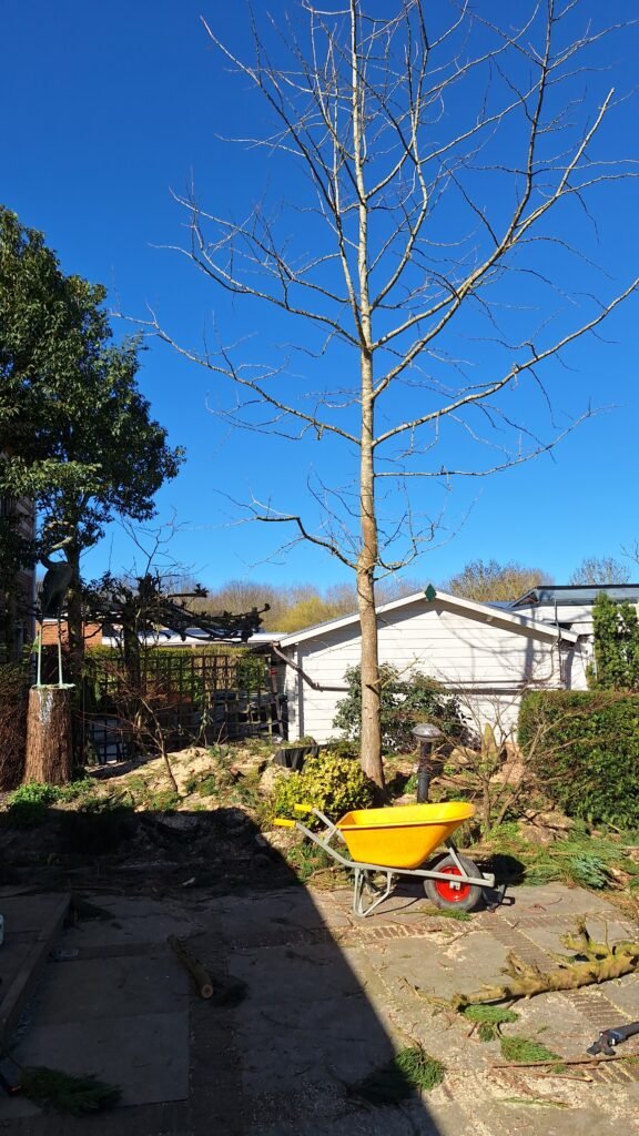 De tuin van deze klant bevatte meerdere bomen die het zonlicht in zowel haar eigen tuin als die van de buren blokkeerden. De bomen zijn stuk voor stuk verwijderd met behulp van klimtechniek. De stronken zijn daarna gefreesd.
